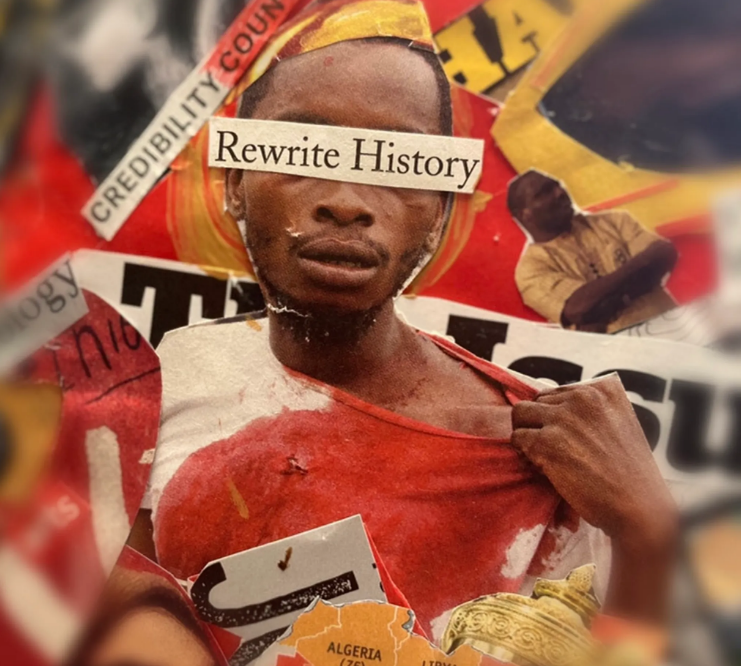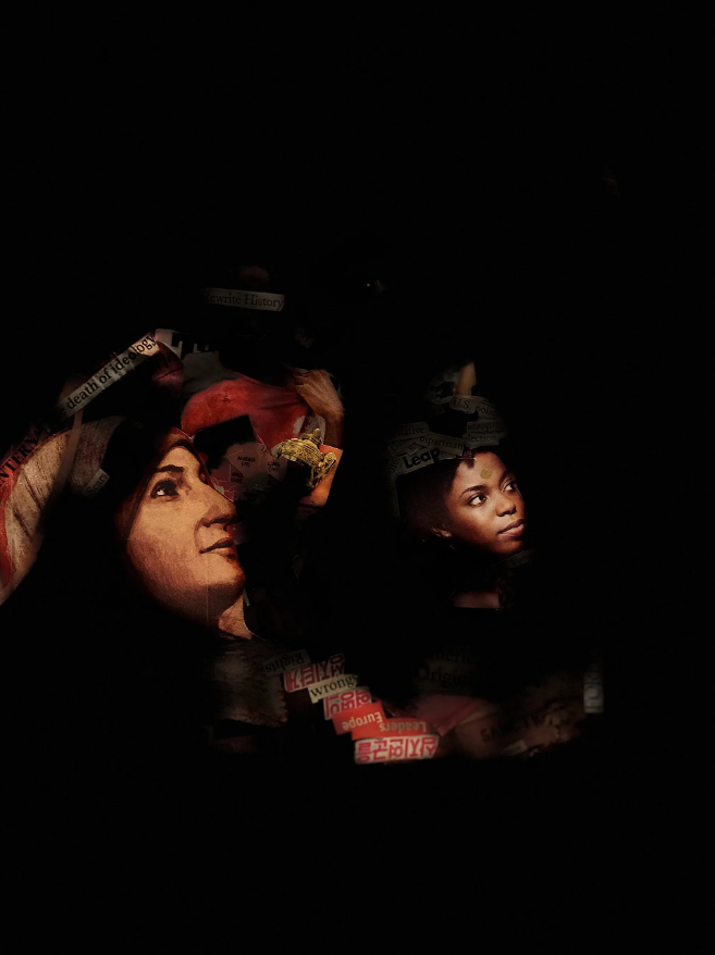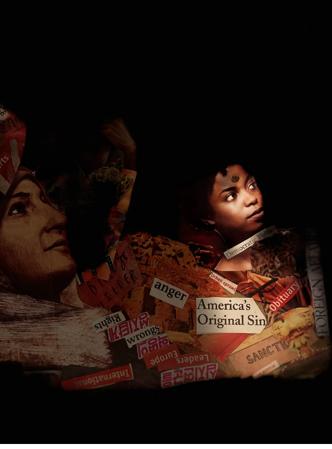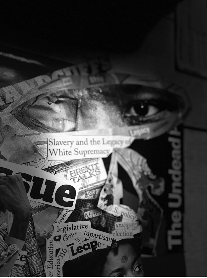 Throughout the collage it depicts different stages in American history from slavery to institutionalized racism to civil rights to xenophobia, there are various stages that we as a country have gone through over the centuries that have led up to the very moment we are in today.